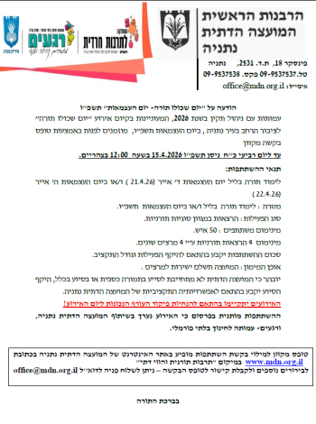 קול קורא - הודעה על "יום שכולו תורה- יום העצמאות" תשפ''ו