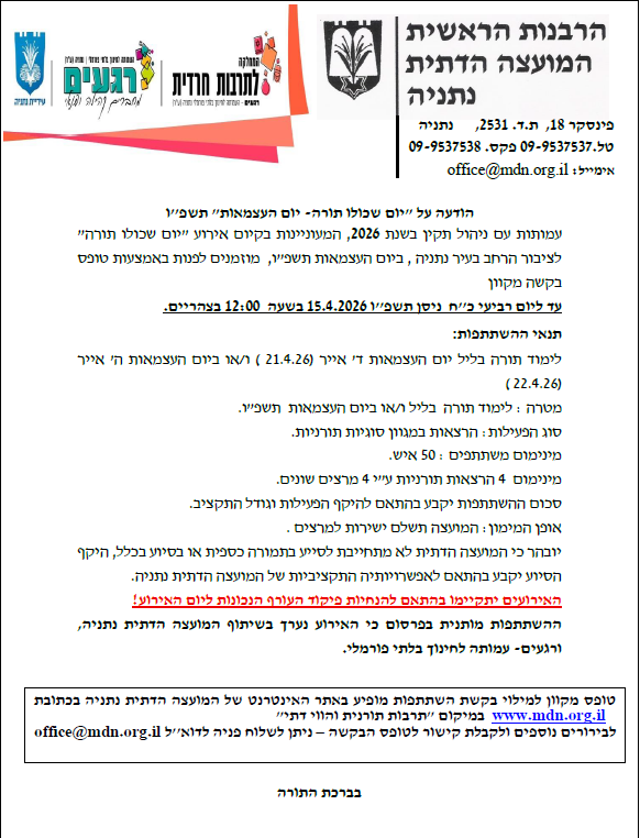 מהנעשה במועצה הודעה על יום שכולו תורה – יום העצמאות אפריל 12, 2026 פורסם על ידי admin 12 אפר קול קורא – הודעה על "יום שכולו תורה- יום העצמאות" תשפ"ו לצפיה בקול קורא למילוי טופס בקשה